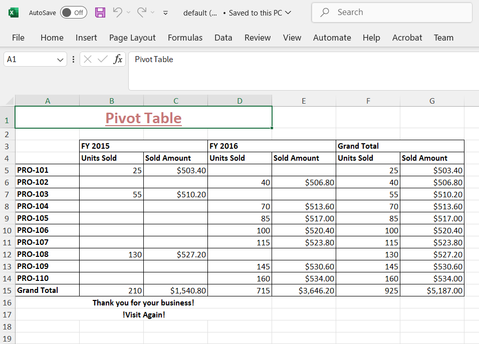 { cells: [{ colSpan: 13, value: "!Visit Again!", style: { hAlign: 'Center', bold: true } }] }