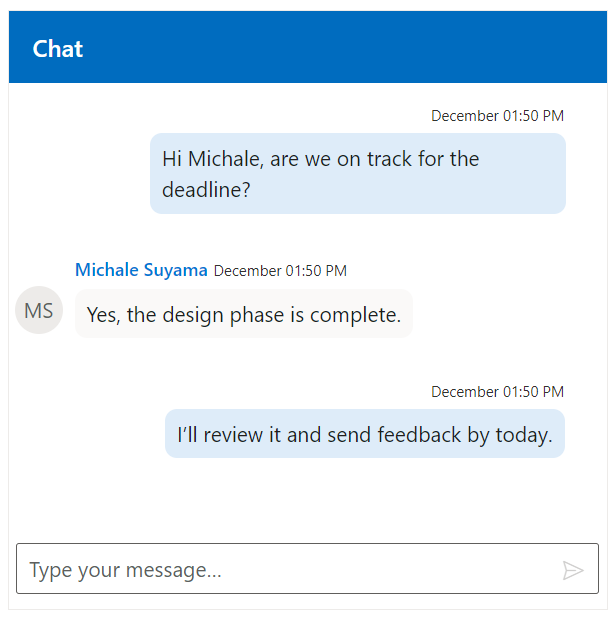 <ejs-chatui id="chatUser" timeStampFormat="MMMM hh:mm a">