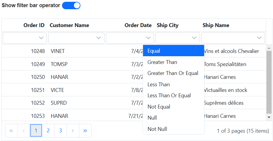 In the Syncfusion® ASP.NET MVC Grid component, you have the ability to modify the filter operator for a column directly within the user interface during the filtering process through the filter bar cell. For instance, the default operator for filtering string-type columns in the filter bar is “startswith”. Now, you can customize the default operator for a specific column using the filter operator feature.