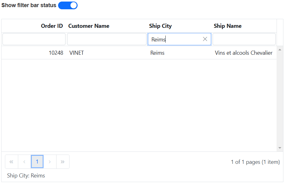 By settings FilterSettings.Mode as OnEnter, the filter bar captures the filter criteria entered but doesn’t initiate filtering until the Enter key is pressed. This allows multiple criteria modifications without triggering immediate filtering actions.