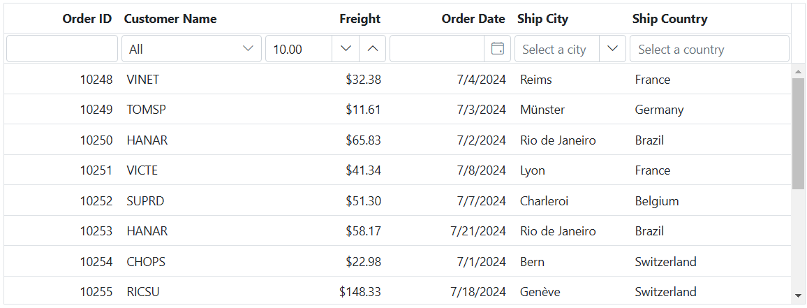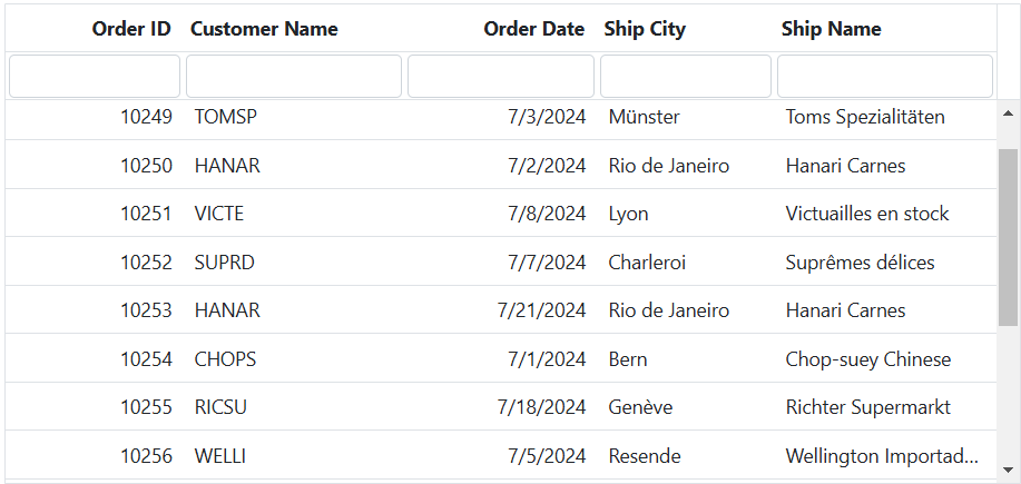 The filter bar feature provides a user-friendly way to filter data in the Syncfusion® ASP.NET MVC Grid. It displays an input field for each column, allowing you to enter filter criteria and instantly see the filtered results.
