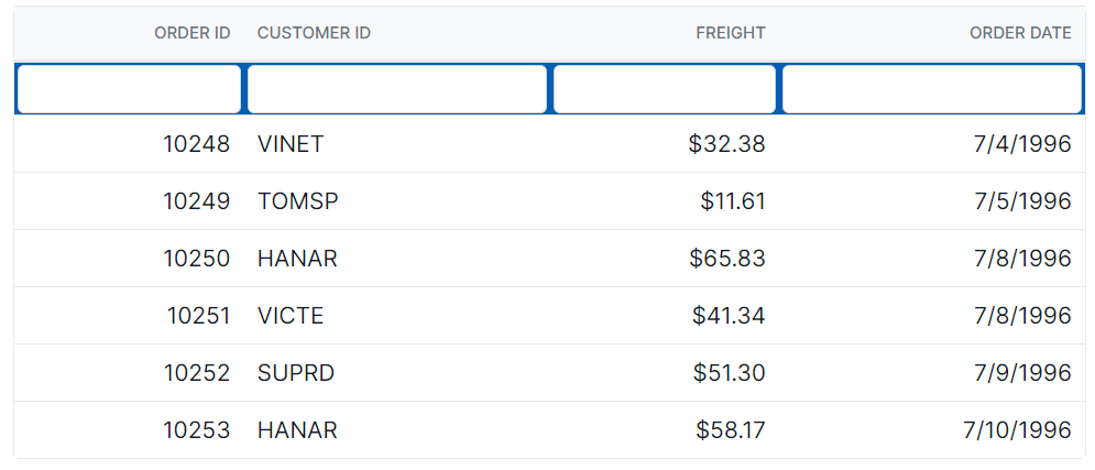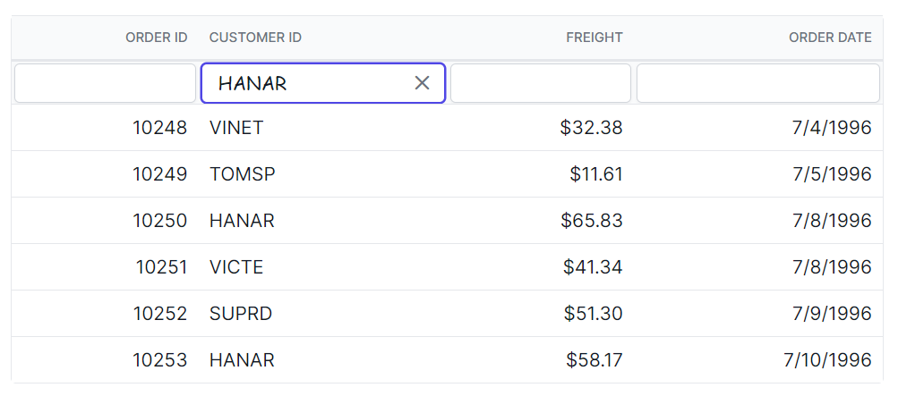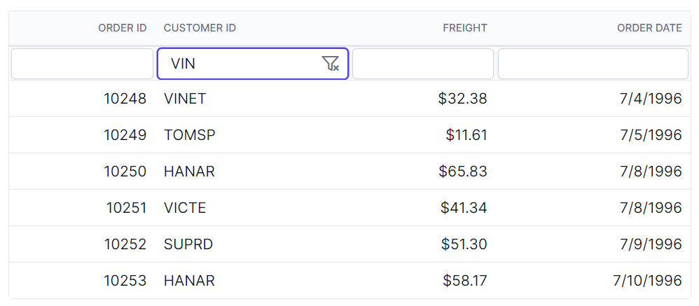 }In this example, the .e-filterbarcell class targets the filter bar cell element, and the .e-input-group.e-input-focus class targets the focused input element. You can modify the background-color property to change the color of the focus highlight.