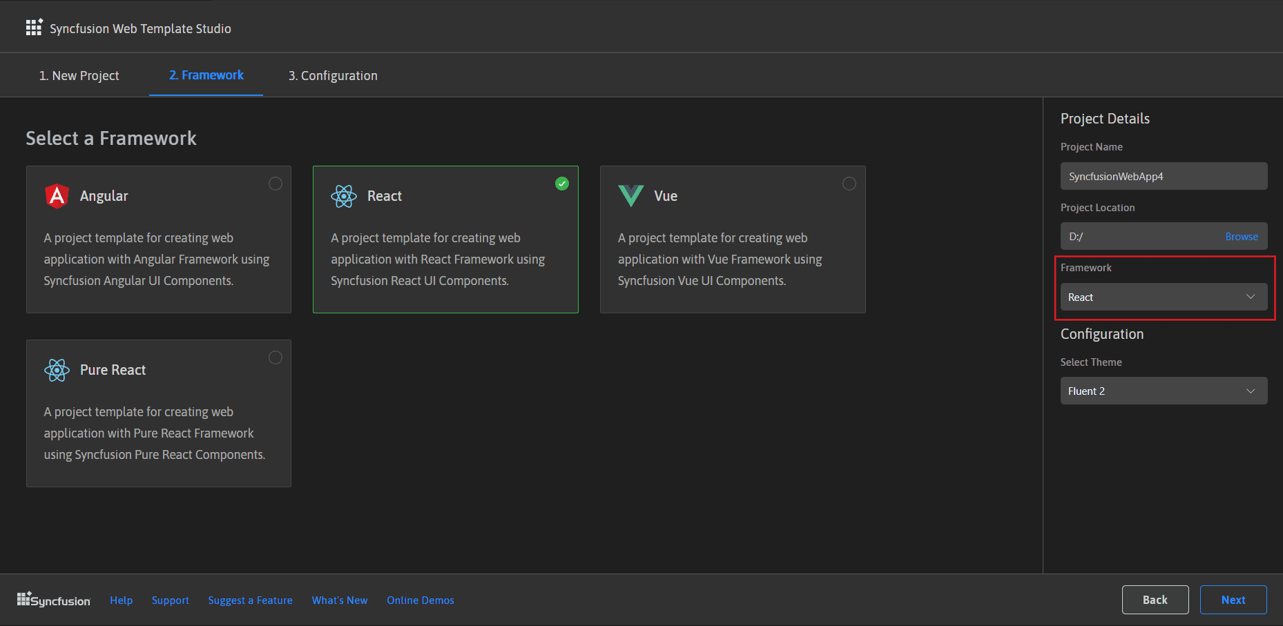 Select Syncfusion® Web Template Studio: Launch and then press enter, Template Studio wizard for configuring the Syncfusion® Web app will appear. Provide the require Project Name and Path to create the new Syncfusion® Web application along with any one of the Framework (React, Pure React, Angular, and Vue).