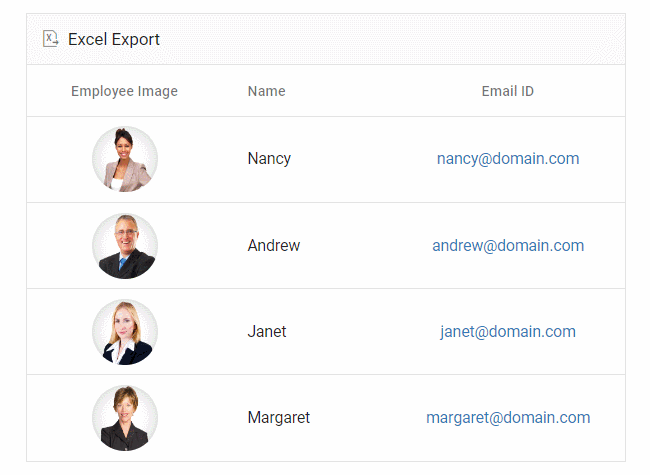The Excel export functionality allows you to export Grid columns that include images, hyperlinks, and custom text to an Excel document.